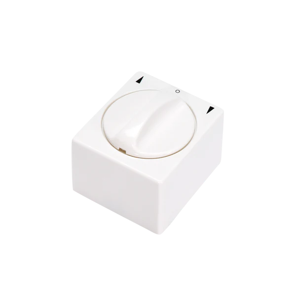 Knebelschalter zur Bedienung von elektrischen Antrieben, komplett mit Abdeckung und Schaltknebel, ultraweiß für auf Putz Montage. Wahlweise mit Tast- oder Rastfunktion verwendbar. Lieferung inkl. Bodenplatte.