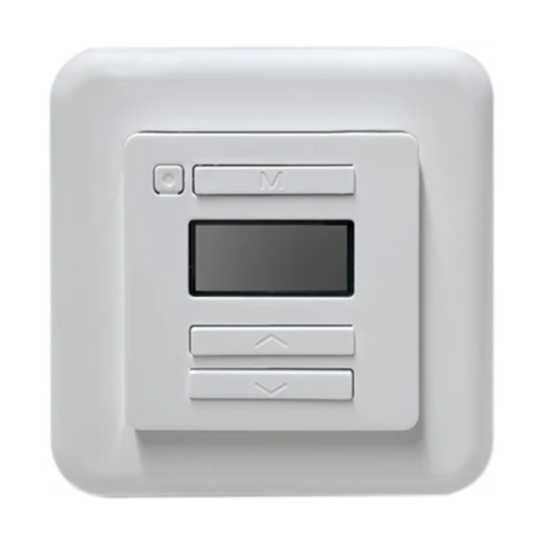 Rollladen-Zeitschaltuhr mit universellen 50 x 50 Abmessungen mit Abdeckung und Rahmen oder zum Einbau in vorhandene Schalterprogramme. Einfache Programmierung der Fahrzeiten, Hand- und Automatikbetrieb und Zufallsgenerator, ultraweiß.