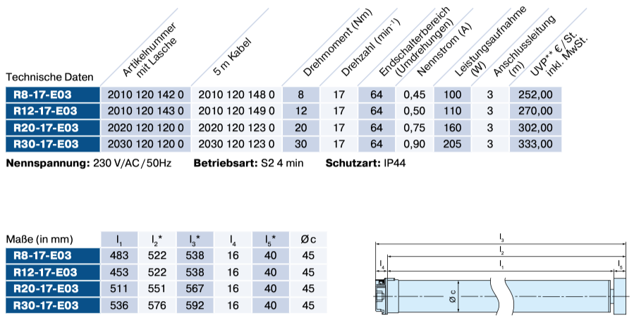 Technische Daten | R8-17-E03 | R12-17-E03 | R20-17-E03 | R30-17-E03 |