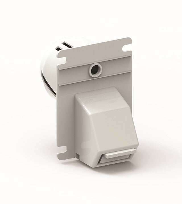 DIHA-Plus - Luftdichte Gurtführung 85 mm hoch 65 mm breit für Fertigkästen zum Ausschäumen Bohrungs- Durchmesser = 50 mm, 40 mm hoch seitlich eingespritzte Stifte verhindern ein Einlaufen der Gurtführung, mit beweglicher Bürstendichtung Luftstrom bei