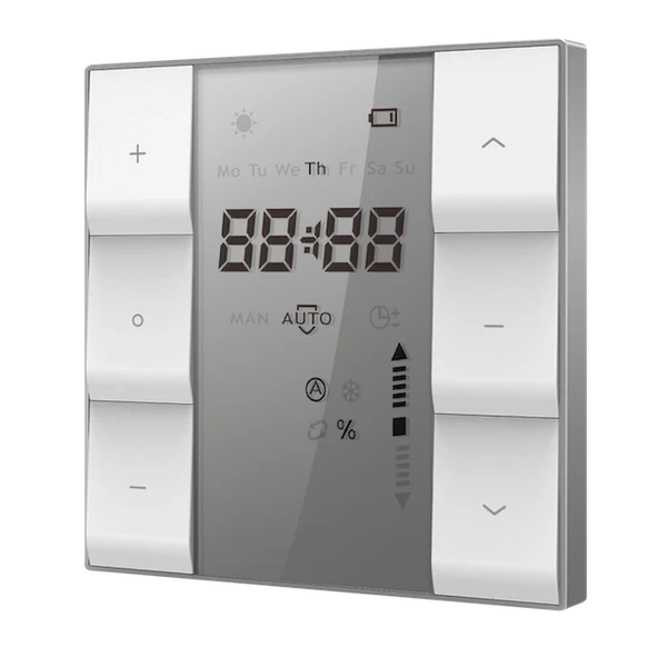 1-Kanal Funkwandsender mit Timefunktion. Einfache Programmierung der automatischen Auf- und Abfahrzeiten, Hand- und Automatikbetrieb, Zufallsgenerator. Lieferung inkl. magnetischer Wandhalterung.
