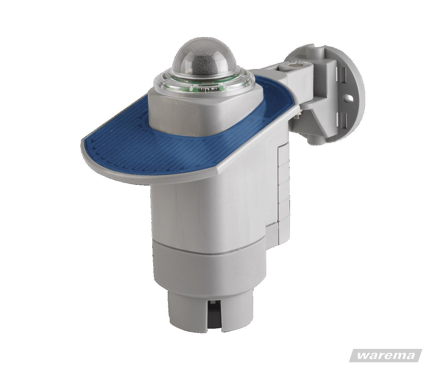 Die WAREMA climatronic® Wetterstation erfasst Windgeschwindigkeit, Windrichtung, Helligkeit, Dämmerung, Niederschlag, Außentemperatur sowie das Funkuhrsignal DCF77 für das WAREMA climatronic® System.
